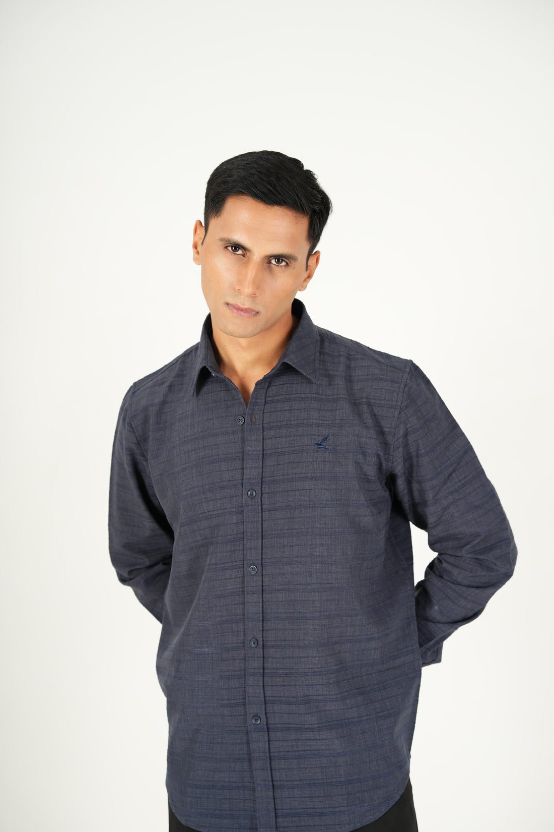 This blue textured matte shirt features full-length sleeves, combining a refined matte finish with subtle...